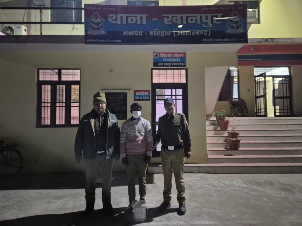 वरिष्ठ पुलिस अधीक्षक हरिद्वार के स्पष्ट निर्देशों के क्रम में अवैध मादक पदार्थों के निर्माण व बिक्री पर सख्त अंकुश लगाने हेतु पुलिस लगातार सतर्क नजर आ रही है।इसी क्रम में पुलिस अधीक्षक ग्रामीण के दिशा-निर्देशन एवं क्षेत्राधिकारी लक्सर के कुशल पर्यवेक्षण में थानाध्यक्ष खानपुर के नेतृत्व में गठित पुलिस टीम द्वारा दिनांक 18 जनवरी 2026 को मुखबिर की सूचना पर त्वरित कार्रवाई की गई। कार्रवाई के दौरान ग्राम कलसिया–डुम्मनपुरी तिराहा से एक व्यक्ति को अवैध कच्ची शराब के साथ रंगे हाथों पकड़ा गया।